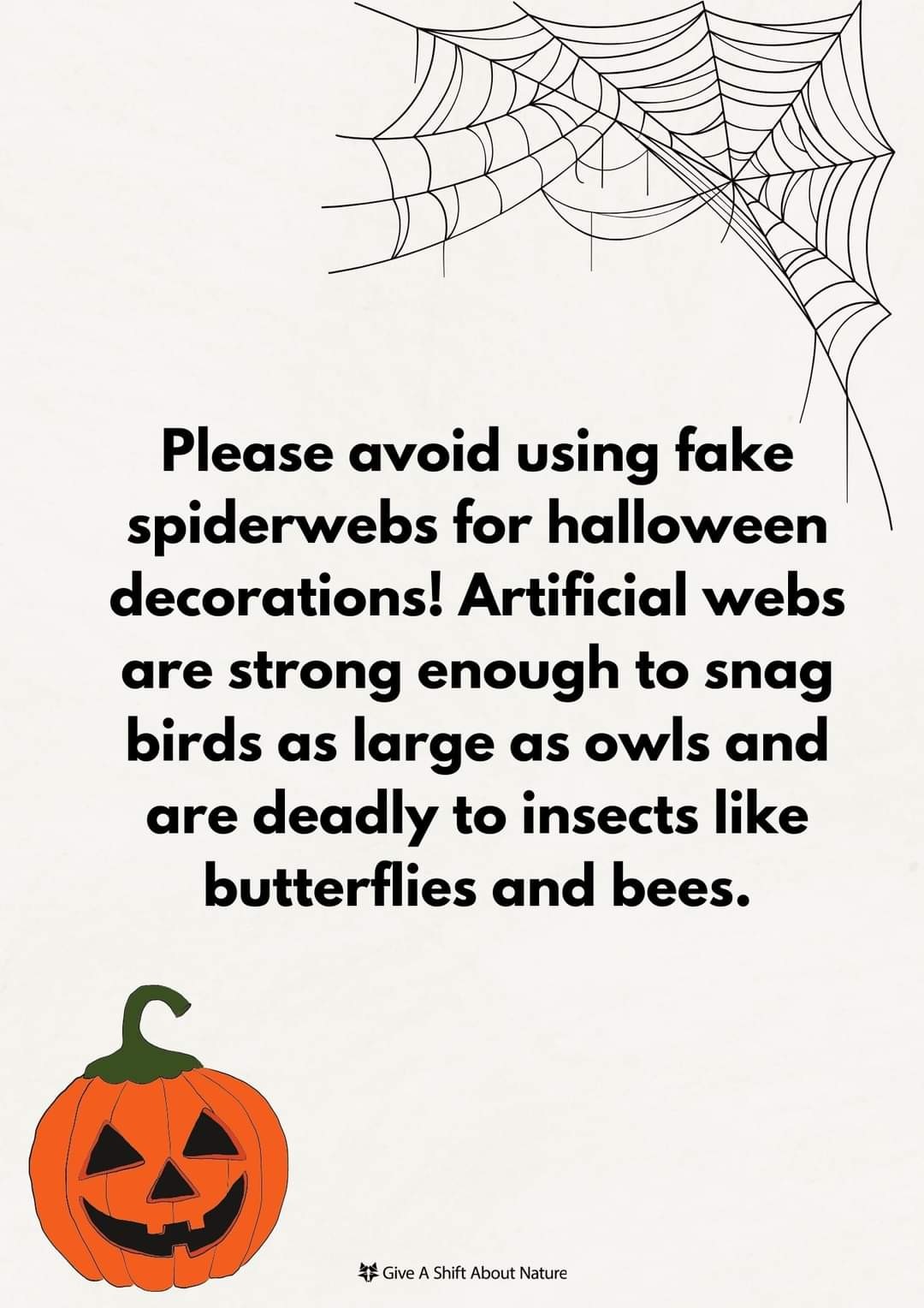 PSA: Please avoid using fake spiderwebs for Halloween decorations! Artificial webs are strong enough to snag birds as large as owls and are deadly to insects like butterflies and bees