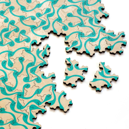 Though each piece is identical they create a pattern which never repeats. It's actually quite a bit more "puzzle-y" than you might expect from a tiling puzzle. That's because, even though it varies infinitely, there is really only one rule which allows you to keep tiling without hitting a dead end. You can assemble the pieces however you like, but figuring out the pattern that allows you to continue forever with no gaps is actually quite tricky